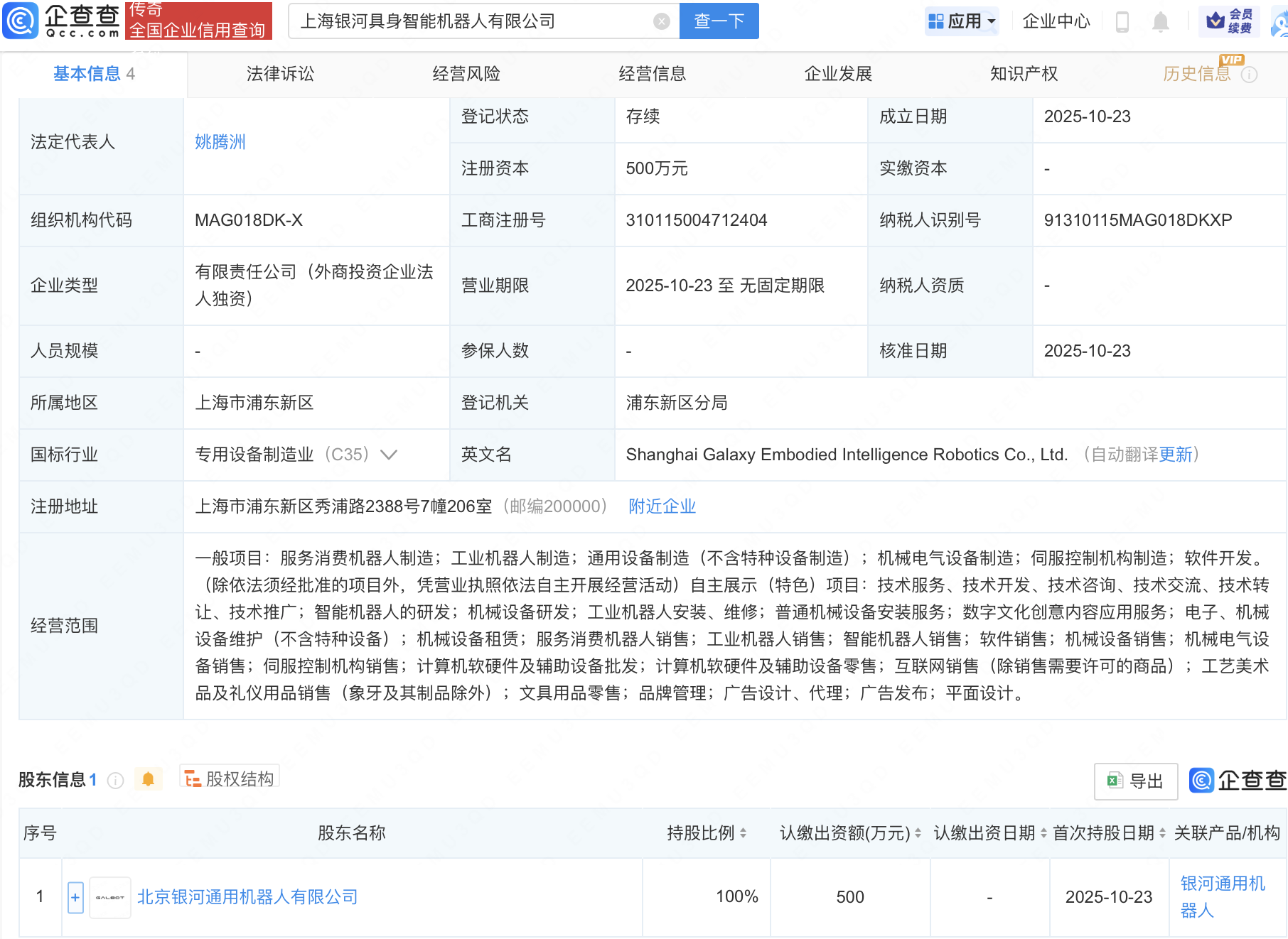 近日,上海银河具身智能机器人有限公司成立,经营范围包含:智能机器人的研发;工业机器人安装、维修;数字文化创意内容应用服务等。企查查股权穿透显示,该公司由北京银河通用机器人有限公司全资持股。